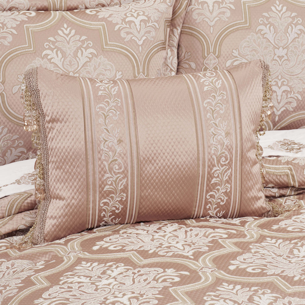 create a custom look on your window with this elegant waterfall valance made with a stunning woven jacquard damask in soft blush, white and gold hues. the lined valance is trimmed with a luxurious tear drop crystal tassel fringe, dyed to match the blush and rose golds in the rosewater comforter set and window panels. in order to achieve the look in the photo, we suggest using three valances (each sold separately).