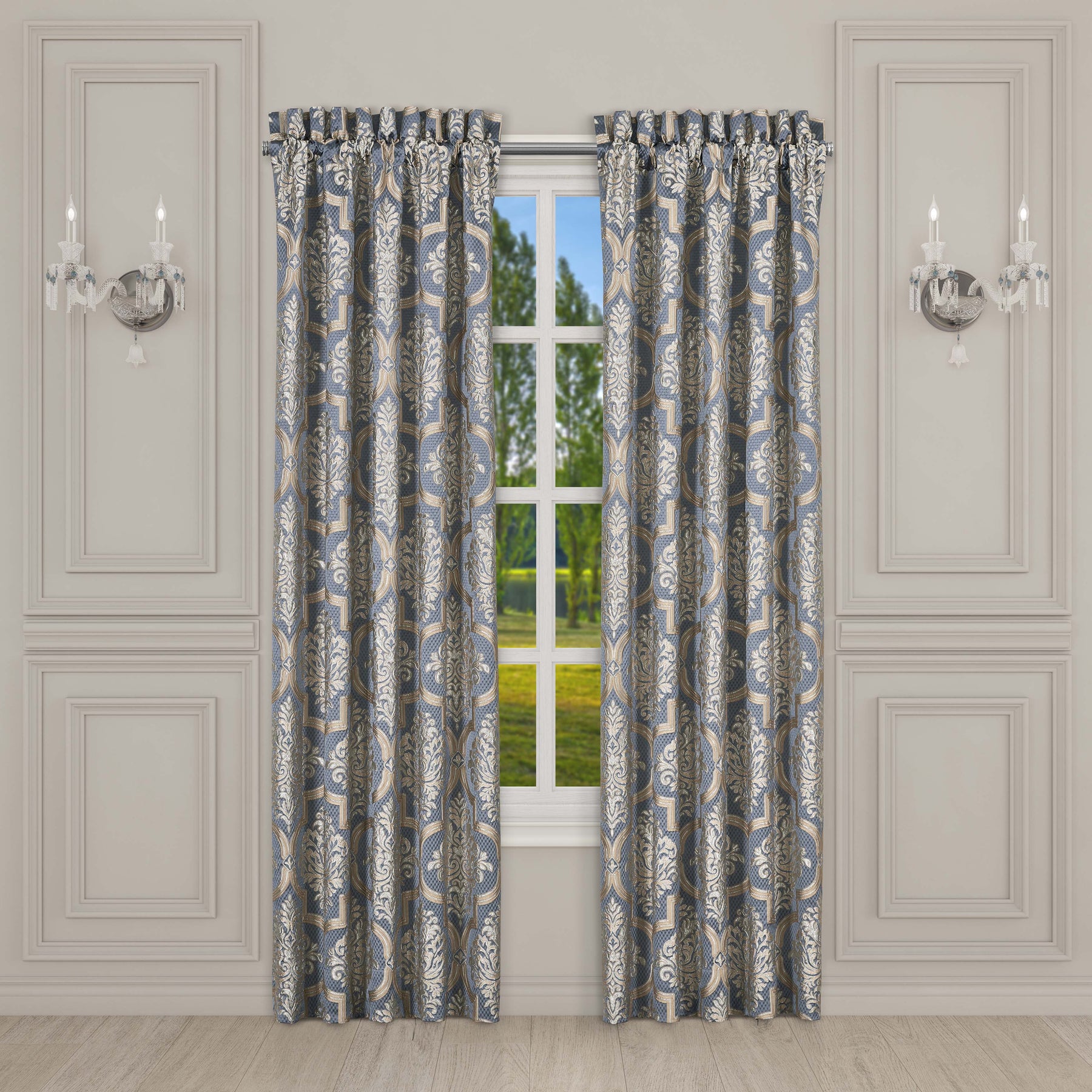The san marino window panels feature an elegant grand-scale damask pattern, which incorporates a unique weave technique giving the appearance of antique white and yellow gold. The powder blue matelassé diamond textured fabric is truly stunning and the reverse is fully lined to provide darkness for comfortable sleep and relaxation. The finishing touch is the matching tie-backs, which help create an open airy look, and the panels can be paired with the san marino valance to complete your bedroom windows.