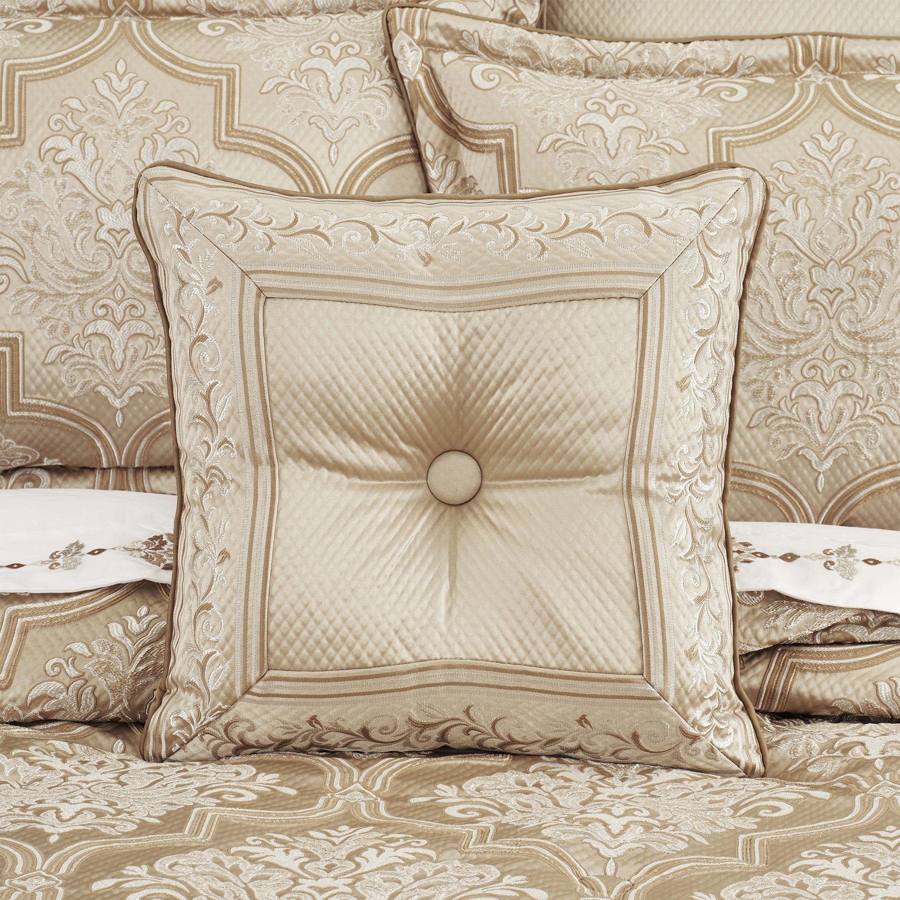 inspired by european elegance, the sezanne 18" decorative throw pillow features a classic damask border pattern, which incorporates a unique weave technique giving the appearance of antique polished metals in white and gold. a tufted button with dyed to match gold satin piping finishes the lofty throw pillow. this luxurious accent pillow is recommended to add as the finishing touch to the sezanne bedding set.