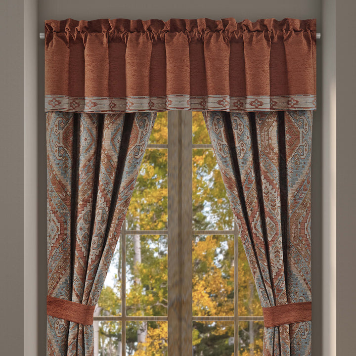 The jackson lodge straight window valance is trimmed with a beautiful southwest inspired embroidered band at the hem. This luxurious window treatment features clay, sand, and turquoise colors, and pairs perfectly with the coordinate window panels and bedding.