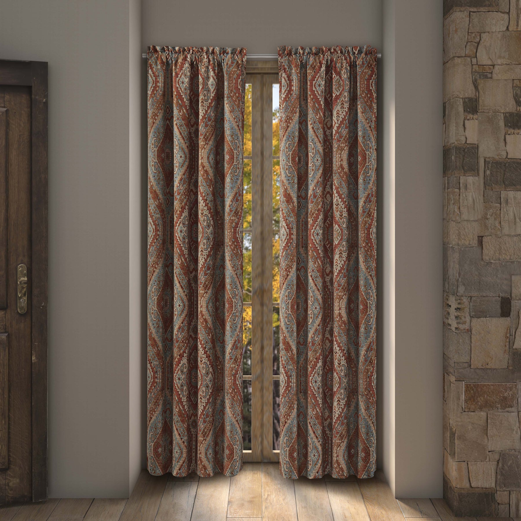 The jackson lodge window panels features a southwest woven jacquard pattern that adds a rustic look to any room. The room-darkening window curtains include tie-backs to help keep natural lighting into your room whenever you desire. The shades are crafted with tones of clay, sand and turquoise and coordinate beautifully with the jackson lodge valance and bedding.