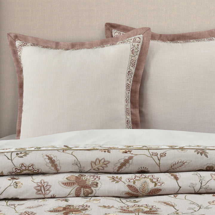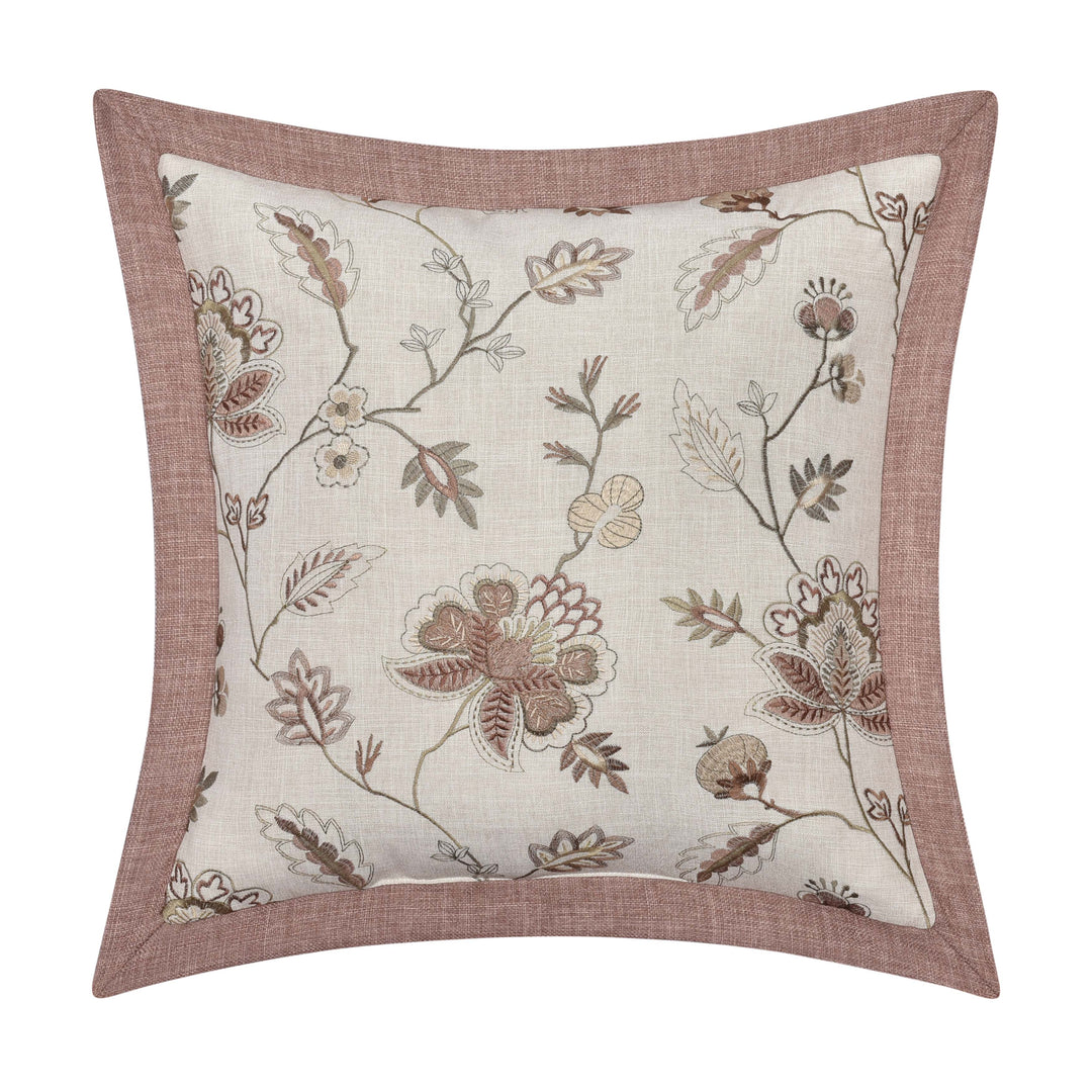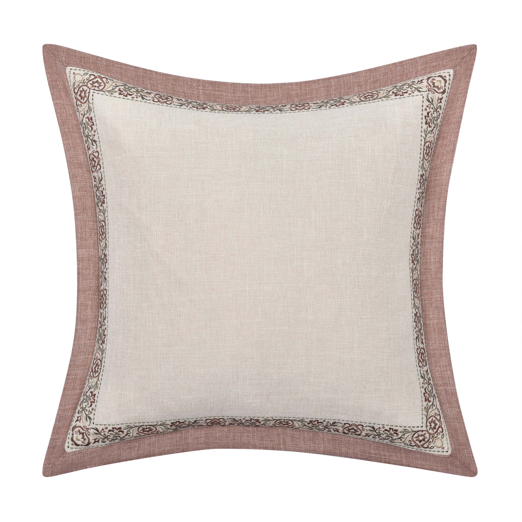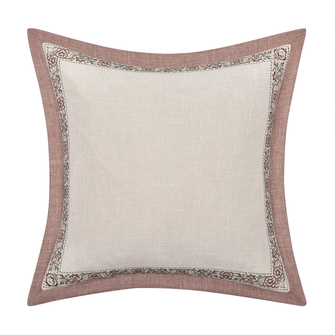 The santa rosa euro sham features a solid textured faux linen, framed and mitered on four sides with an intricately embroidered floral stripe design. The edge of the euro is finished with a folded flange in blush, which pairs nicely with the dusty sage, and soft cream yarns from the embroidery. Complete the look by adding the santa rosa throw pillows, window treatments, and bedding set.