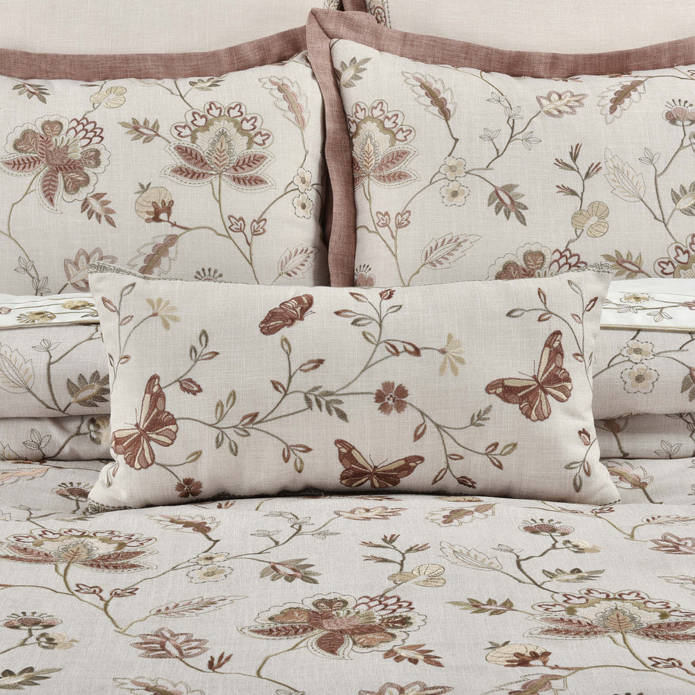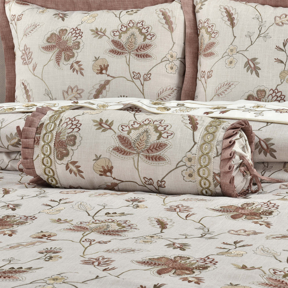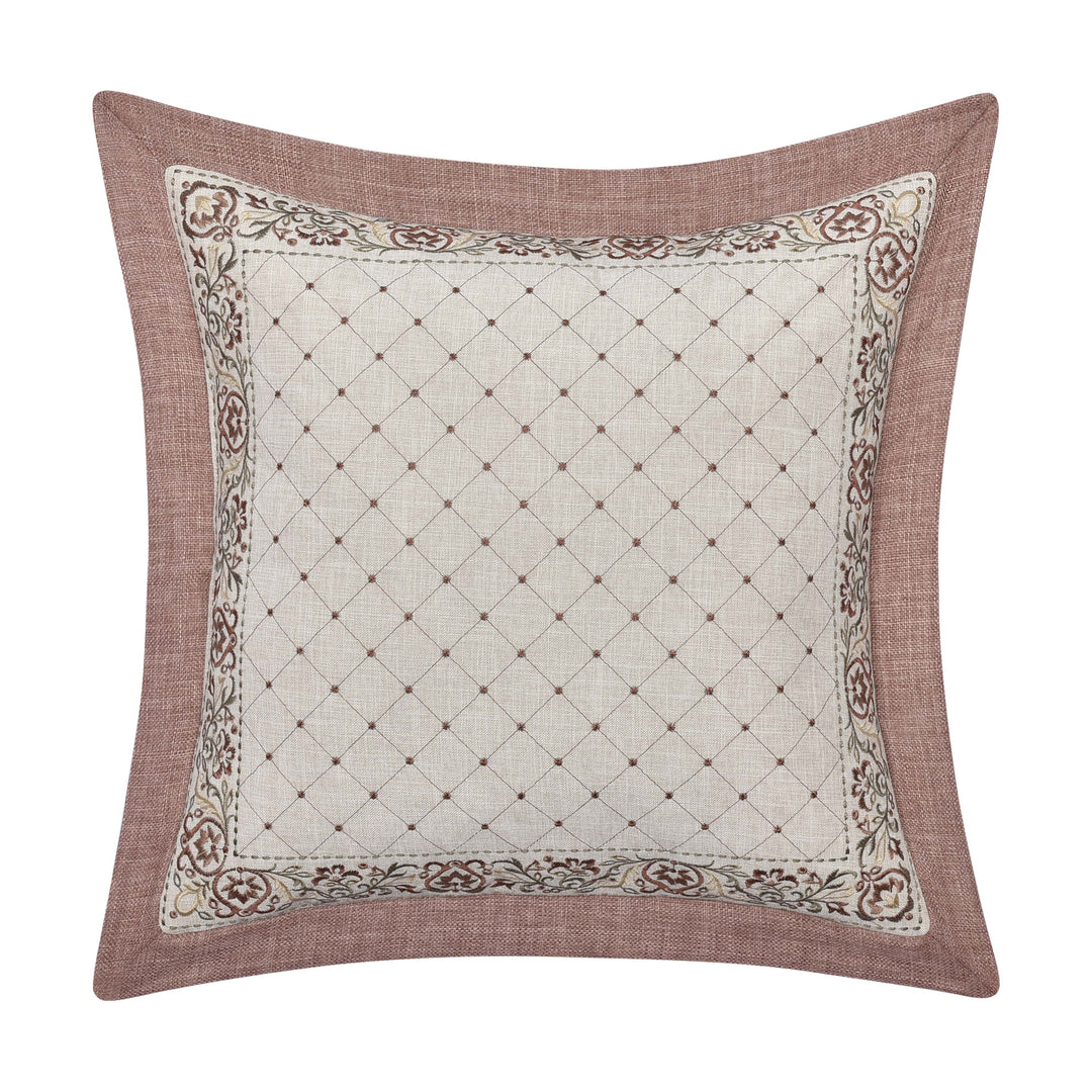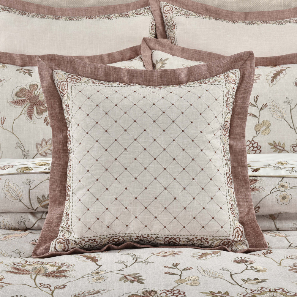 The santa rosa euro sham features a solid textured faux linen, framed and mitered on four sides with an intricately embroidered floral stripe design. The edge of the euro is finished with a folded flange in blush, which pairs nicely with the dusty sage, and soft cream yarns from the embroidery. Complete the look by adding the santa rosa throw pillows, window treatments, and bedding set.