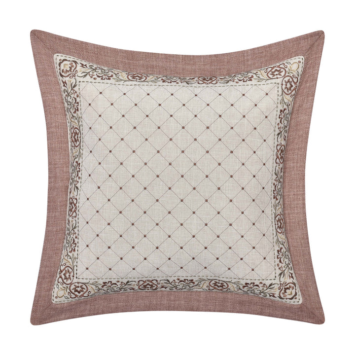 The santa rosa 18 inch throw pillow features a textured faux linen with shades of blush, dusty sage, and soft cream. An embroidered lattice starburst dot detail is framed and mitered on four sides with an intricately embroidered floral stripe, and flange trim, making it a timeless accent to your home decor and it coordinates with the santa rosa bedding and window treatments.