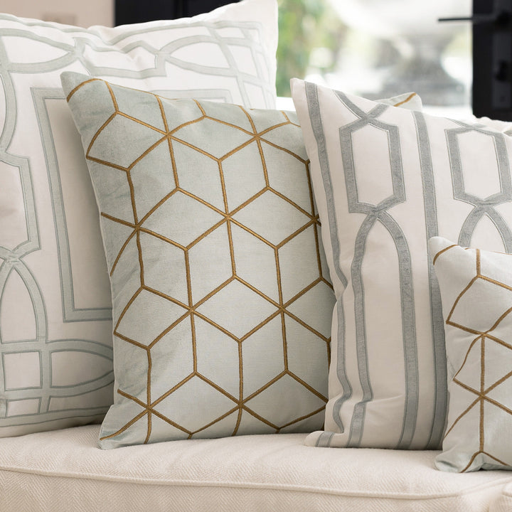 The Cube Square Pillow is made with Aquamarine Velvet and Antique Gold Embroidery.