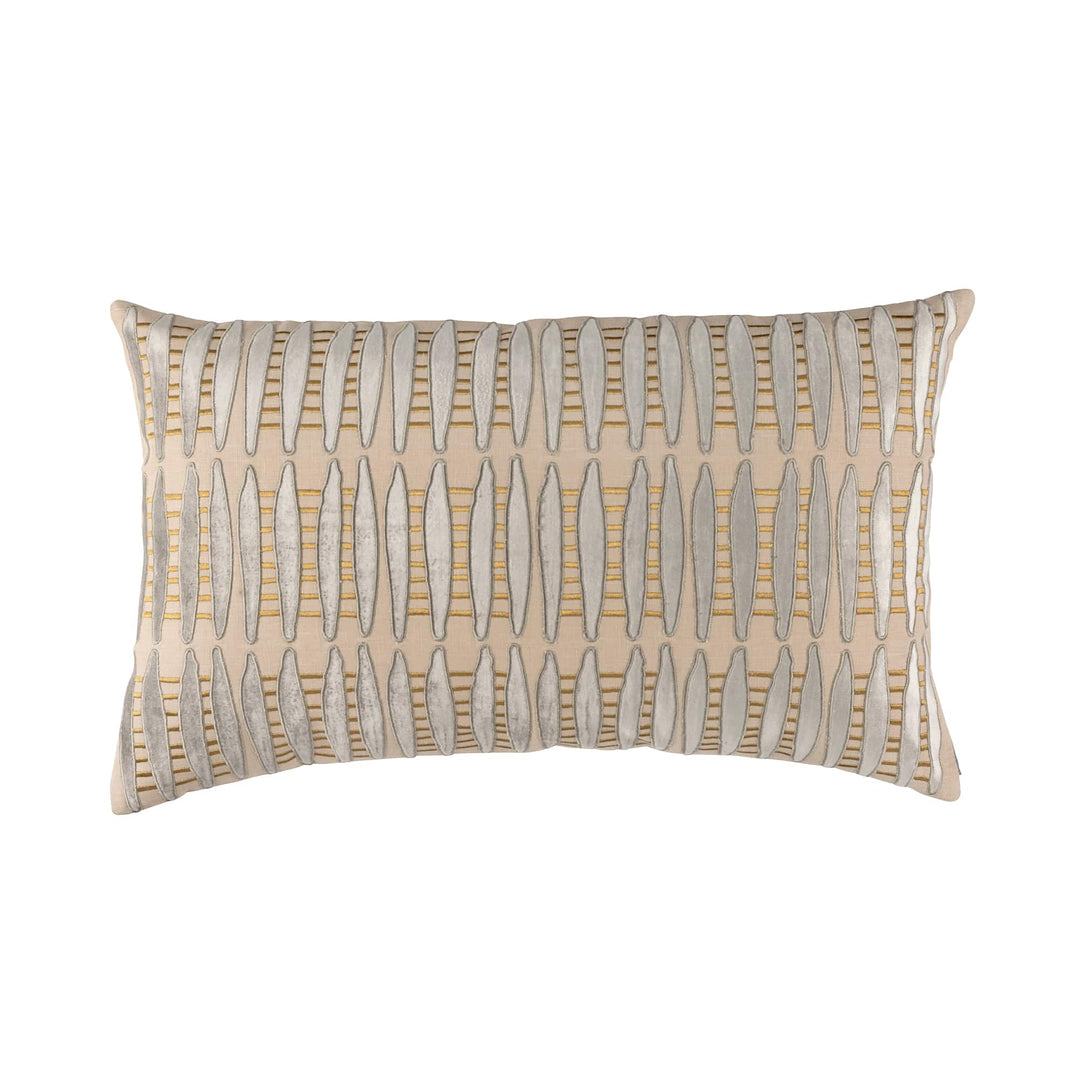 The Ivy Large Rectangle Pillow is made with Dark Sand Linen, Platinum Velvet Appliqu, and gold embroidery.