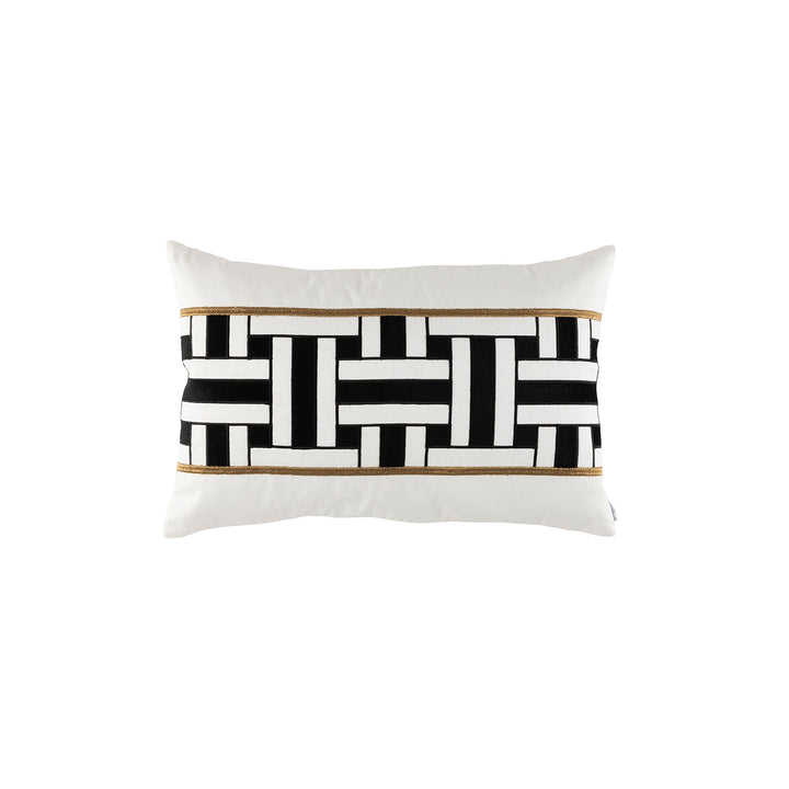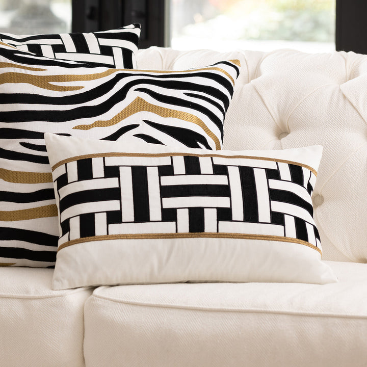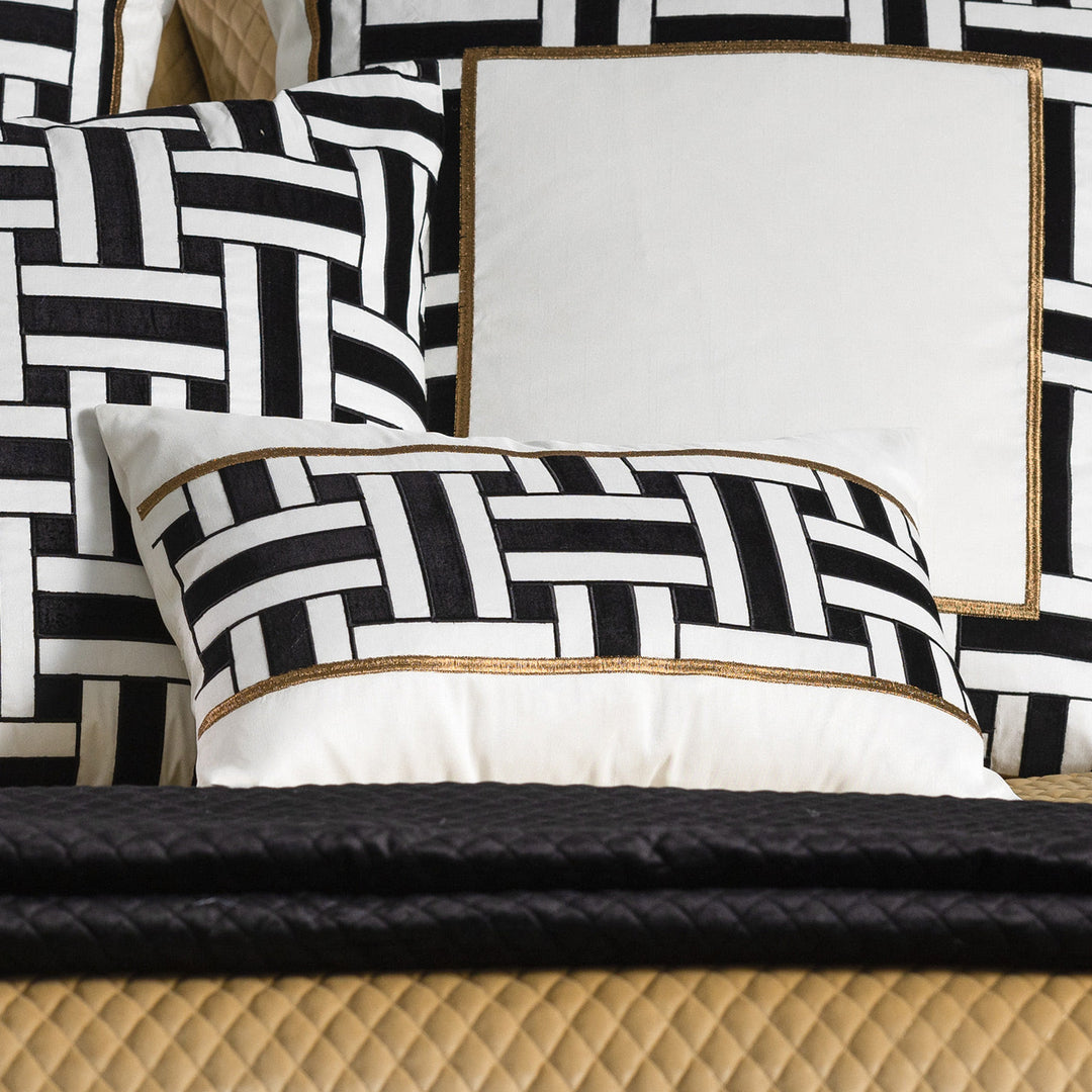 The Tommy Small Rectangle Pillow is made with Ivory Venetian Silk, Black Velvet Appliqu, and Antique Gold Embroidery.