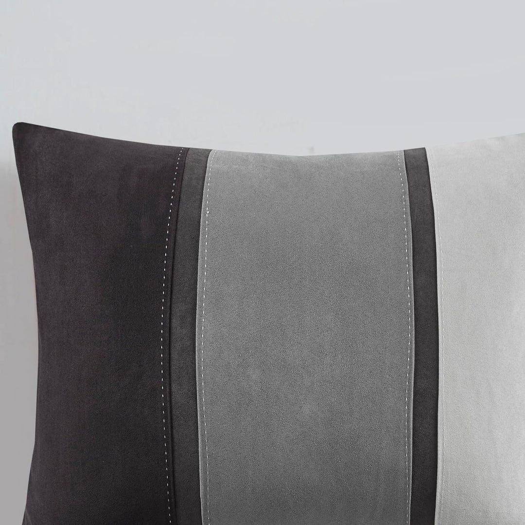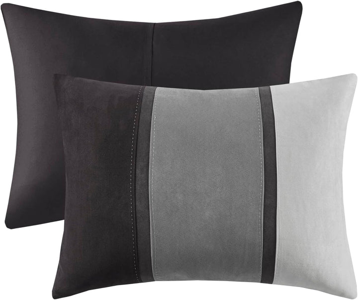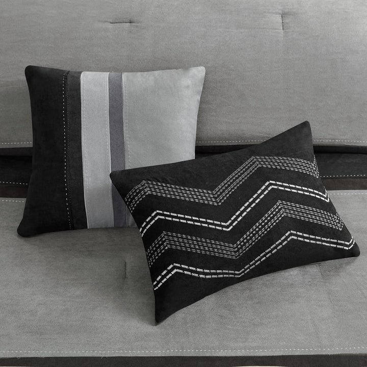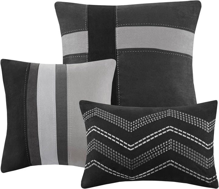 The Madison Park Palisades 7 Piece Faux Suede Comforter Set offers you a casual alternative in fashion bedding. The reverse of the comforter is solid black. The soft microsuede in light grey, charcoal, and black is pieced together to create this beautiful bed. The decorative pillows are embroidered and pieced to add a decorative element to this simple, yet beautiful bedding collection. With hypoallergenic filling in the comforter and pillows, this stylish comforter set easily refreshes your bedroom decor and is machine washable for easy care. Items in the set may come in a rolled or compressed packaging, which will need to be fluffed up or steam ironed before use to remove wrinkles.