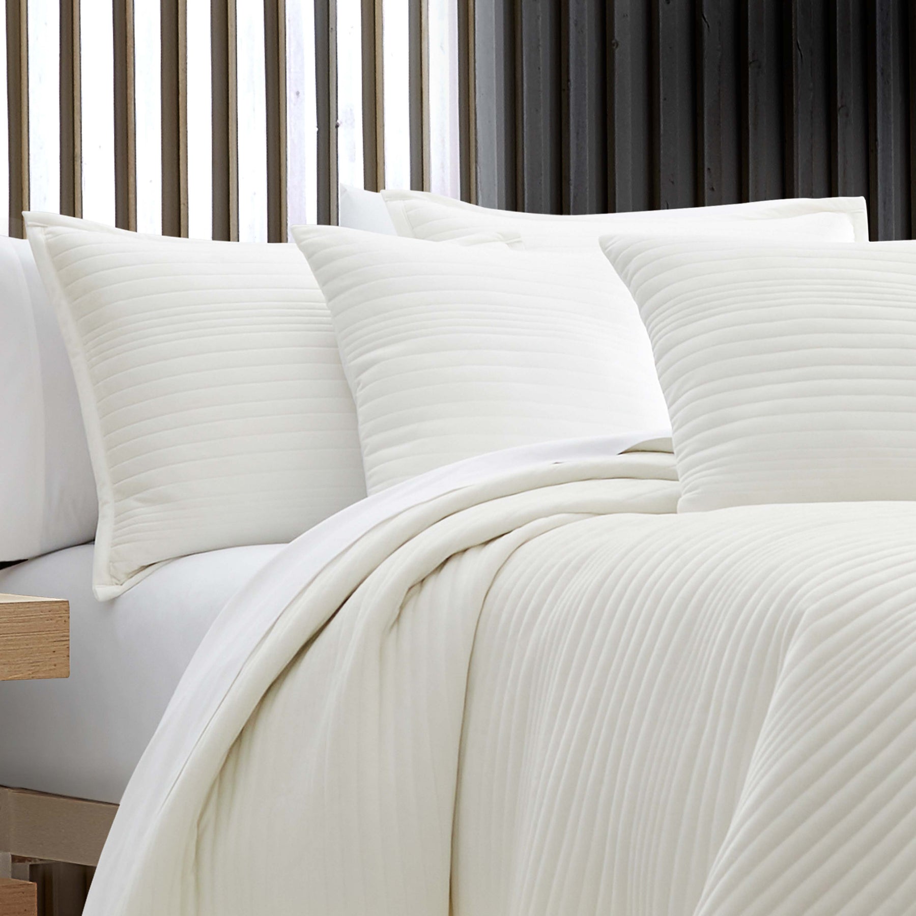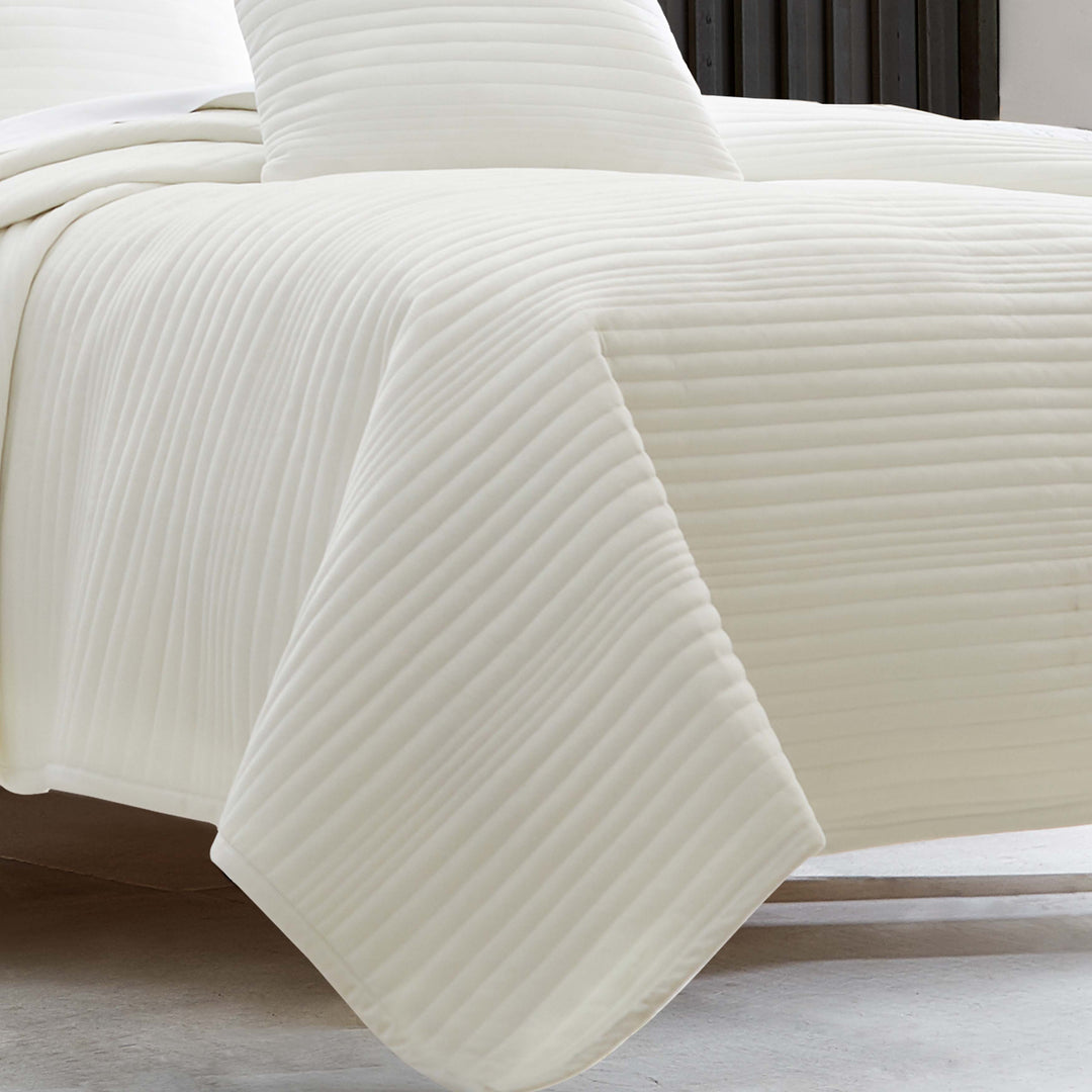 The mercer quilt combines soft velvet fabric with a channel quilted alternating stripe size construction, delivering both sophistication and comfort. The perfect mediumweight layering piece, this quilt adds understated style and function to your bedroom. Coordinate pillow shams and a throw pillow are available separately to complete the contemporary look.