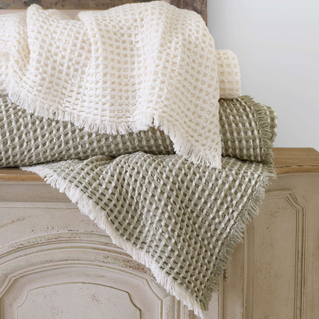Warm and inviting, this extra layer for your bed is lofty, frothy, and woven in Portugal to look and feel like the softest of sweaters. In a buttery blend of cotton and soft wool, this whisper-weight waffle stitch blanket is made extra comfy and cozy with parallel ridges of tucked ribs for a feast of lightweight texture and insulating comfort. Designed for us by Marie Flanigan, an award-winning interior designer and principal of Marie Flanigan Interiors, to reflect her signature style of timeless elegance and innovative simplicity.