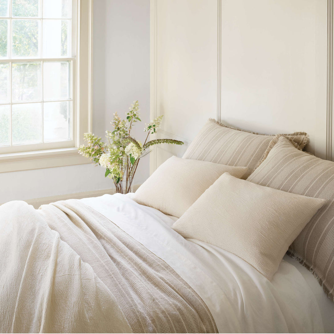 A lovely deconstructed, crinkle pattern matelassé duvet cover and sham add lashings of textural wabi-sabi to a sleek white bed when paired with tailored sheets, shams, and bed skirts. Woven from cool comfy cotton, stonewashed and tumbled to buttery soft laundered comfort.