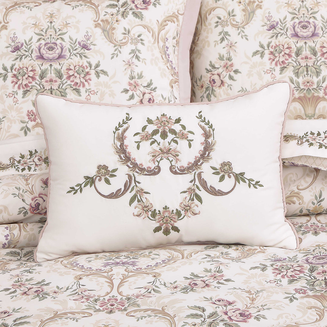 The avant garden boudoir pillow is crafted with a unique floral motif embroidery on a white ground using a combination of fresh blush, violet, and green stitching that match back to the bed set. The pillow has a blush cord all-around to add a quality finishing touch and beautiful addition to the avant garden bedding collection.
