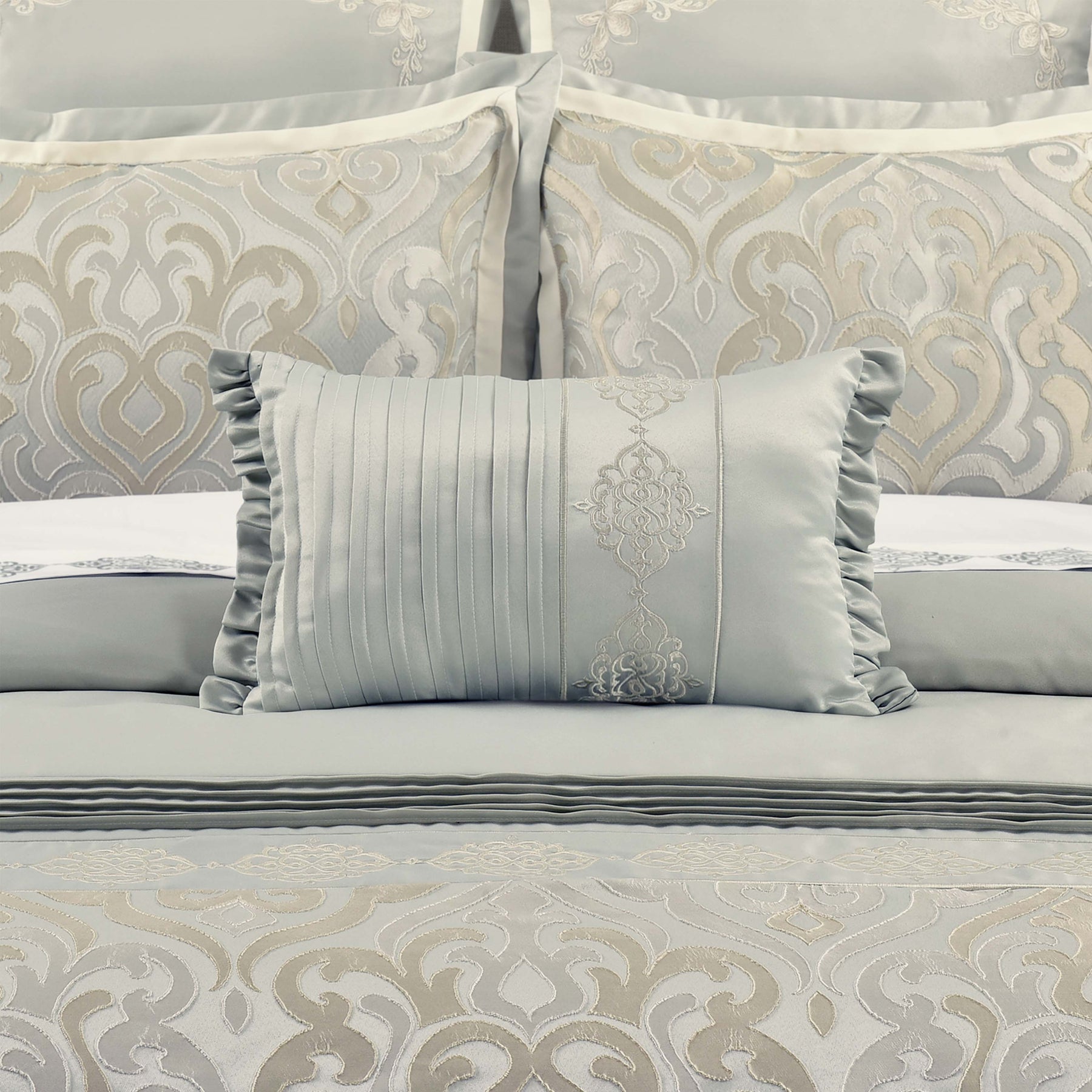 The calmfield boudoir pillow is intricately designed with a damask stripe in stunning shades of aqua, cream, and gold hues. The boudoir pillow reverses to a coordinating aqua fabric and is finished with a pleated flange. Add the calmfield comforter set and window collection to complete the look.
