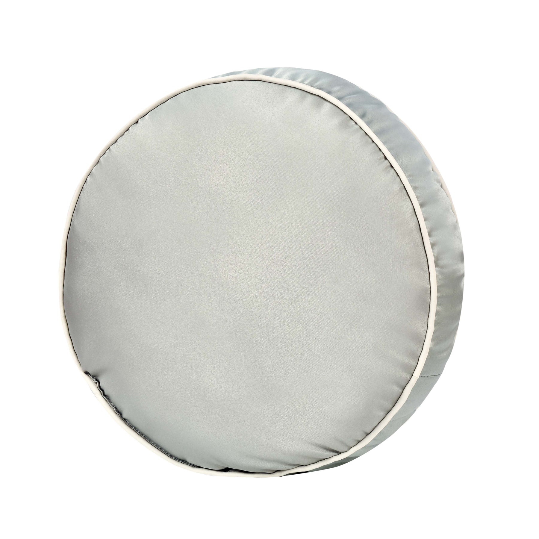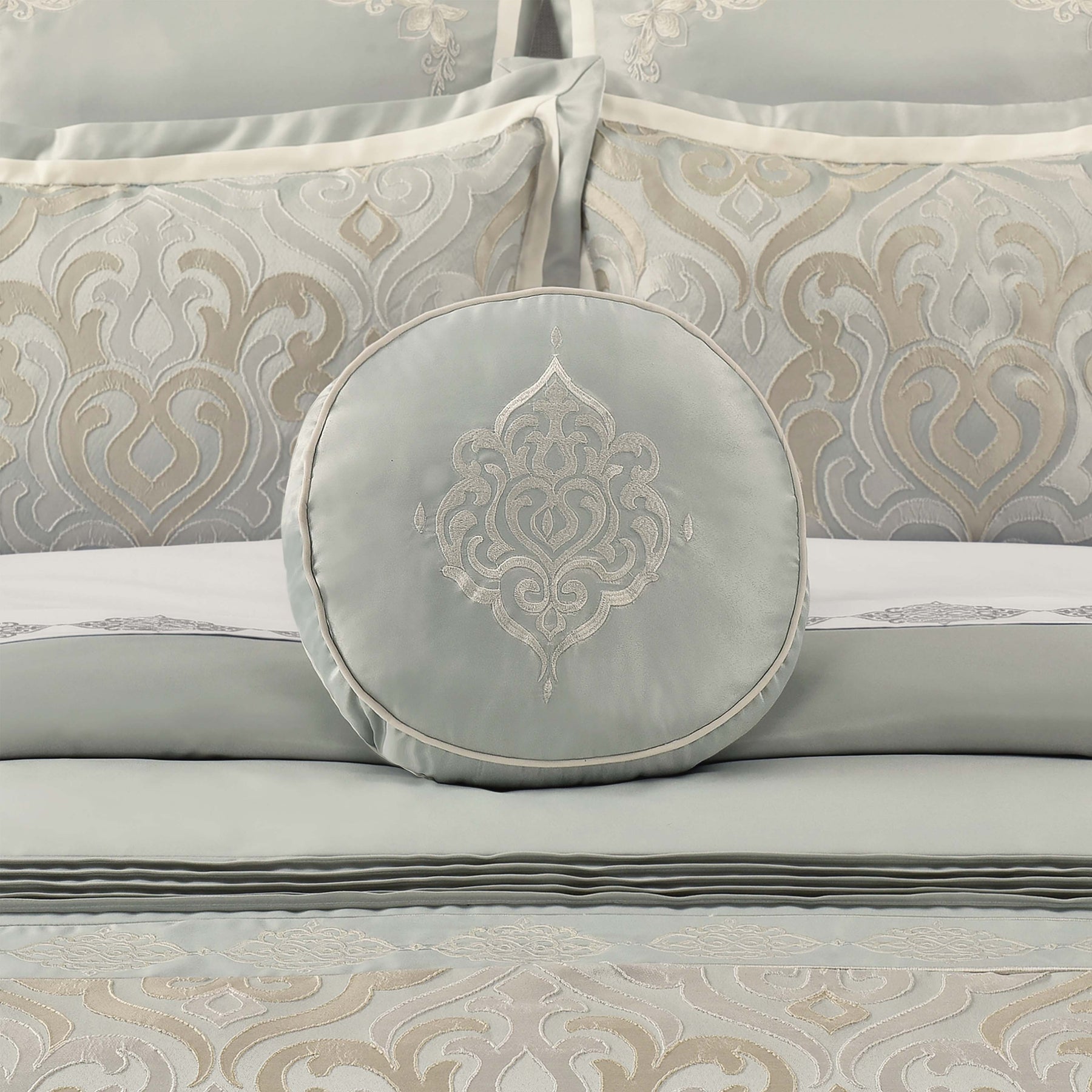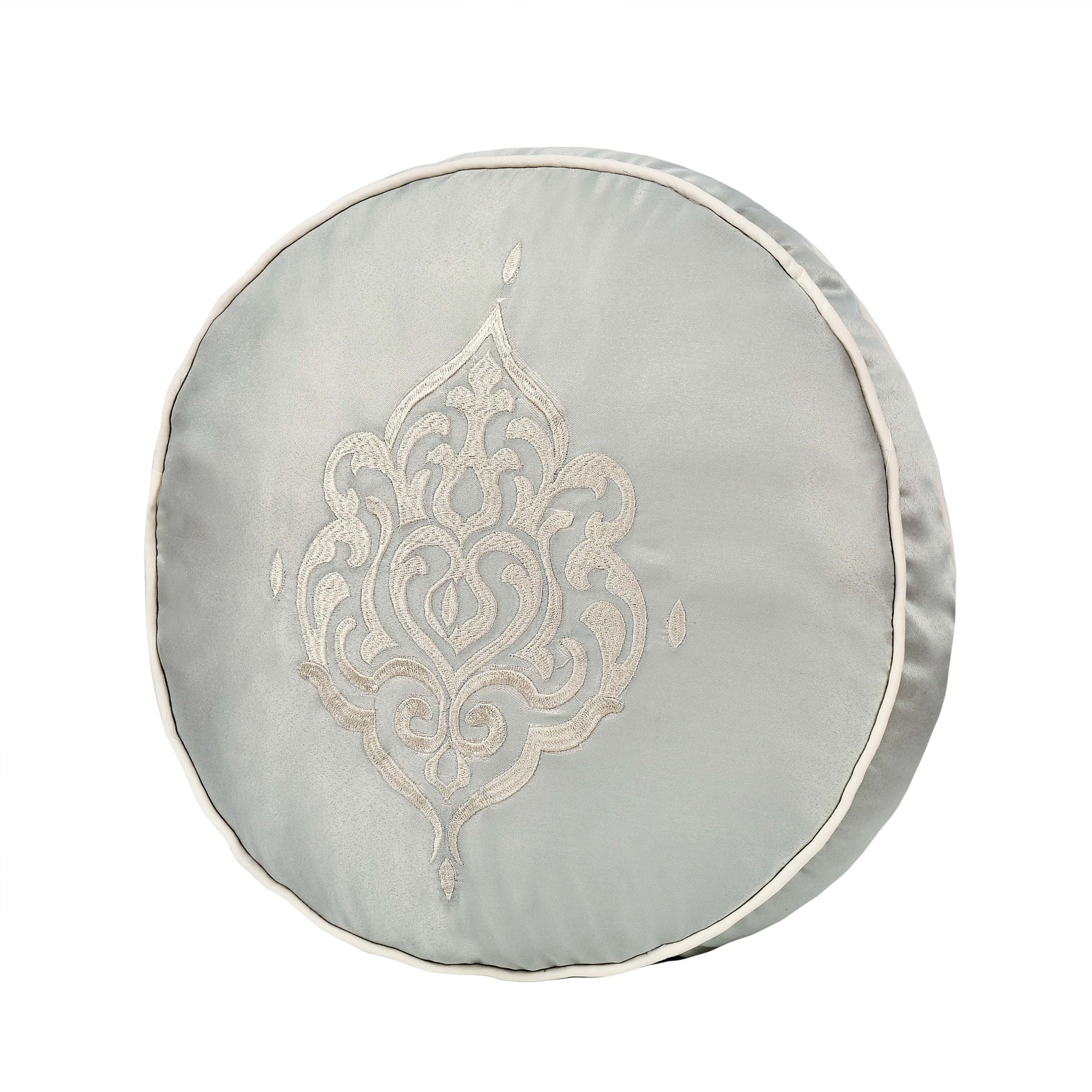 The calmfield tufted round pillow features a matte satin fabric in a soft aqua color to create a one-of-a-kind accent to this bedding ensemble. These unique pillows are hand-sewn. Pair this pillow with the calmfield comforter set for a complete, elegant look.