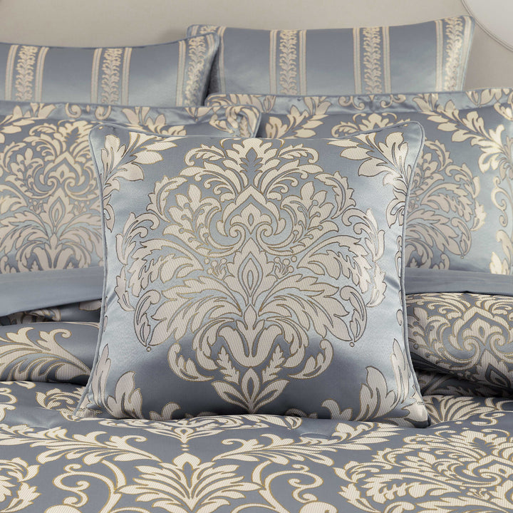 The lorenzo 20 inch decorative throw pillow features a sophisticated woven damask in cream tones against a soothing soft blue satin backdrop. The reverse is made with a woven damask stripe design, making it a perfect multi-use addition the lorenzo comforter set.