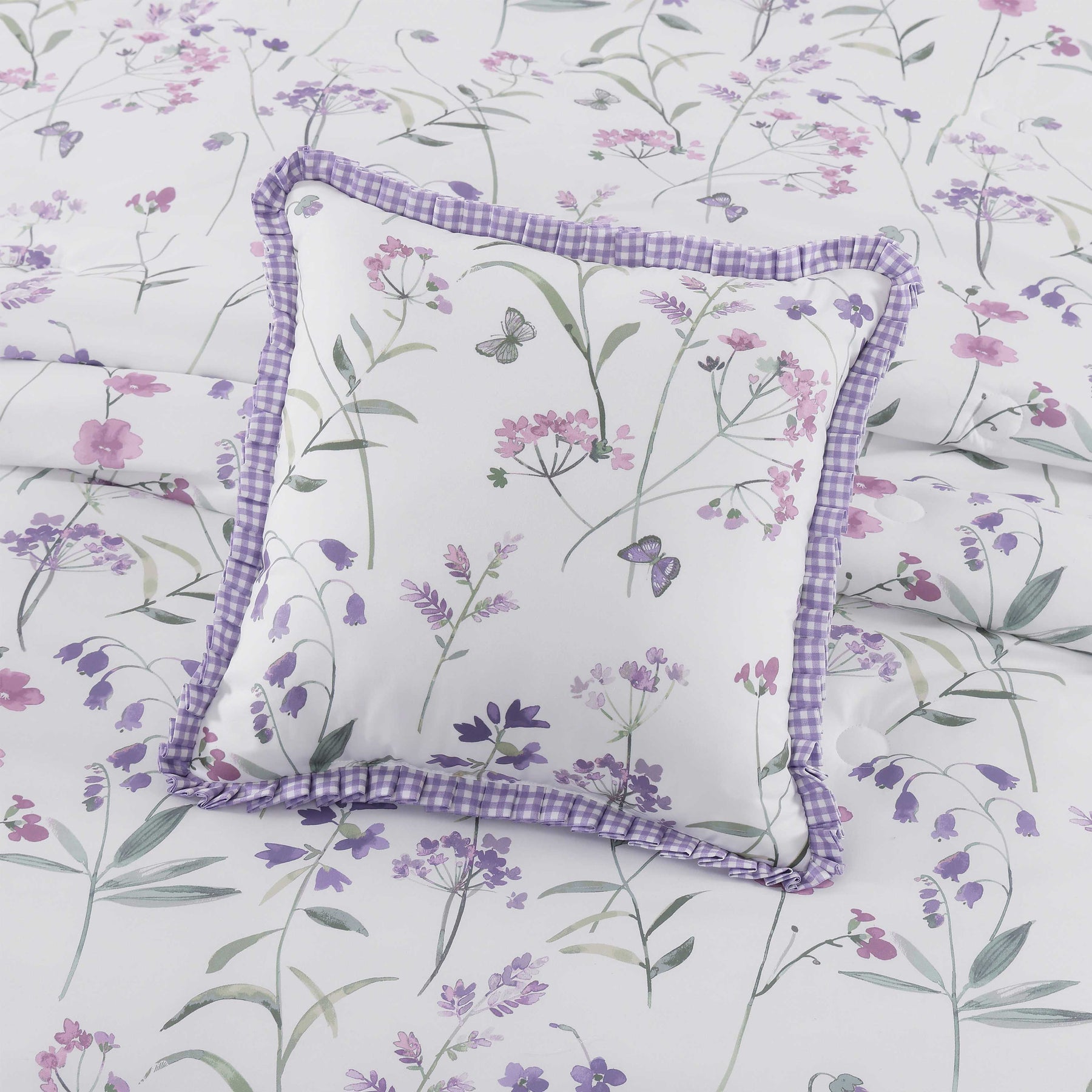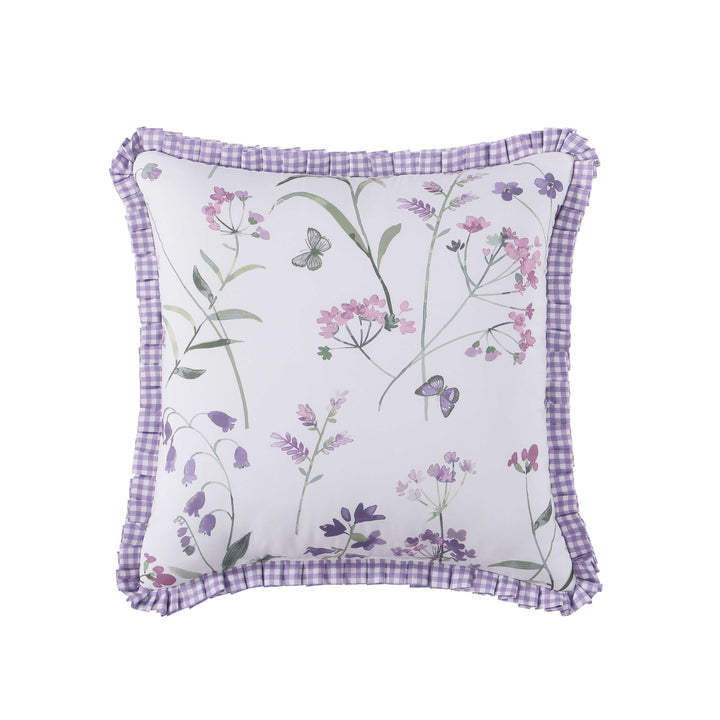 The nola 18 inch square decorative throw pillow features a whimsical floral design in english lavender and lilac colors. The pillow is trimmed with a gingham check pleated flange and a reversible floral design that adds the finishing touch. Layer this accent pillow with the nola bedding ensemble and add the window treatments to complete the look.