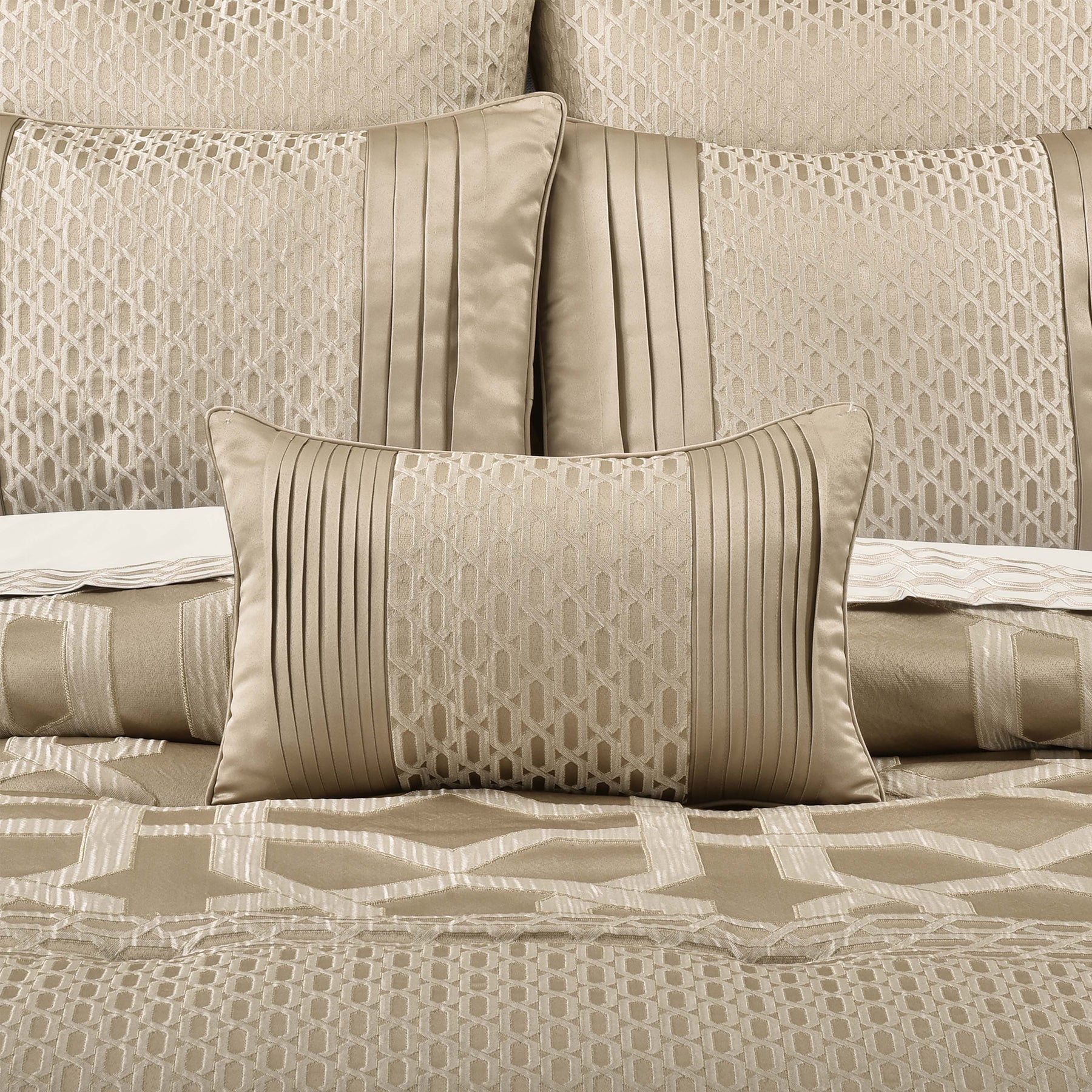 The modern olympus boudoir pillow adds a tasteful touch of modern refinement to your decor. The sand colored accent pillow is designed with a woven geometric pattern, pleats for added texture, and it is finished with satin piping. Add this throw pillow to complete the olympus bedding collection.