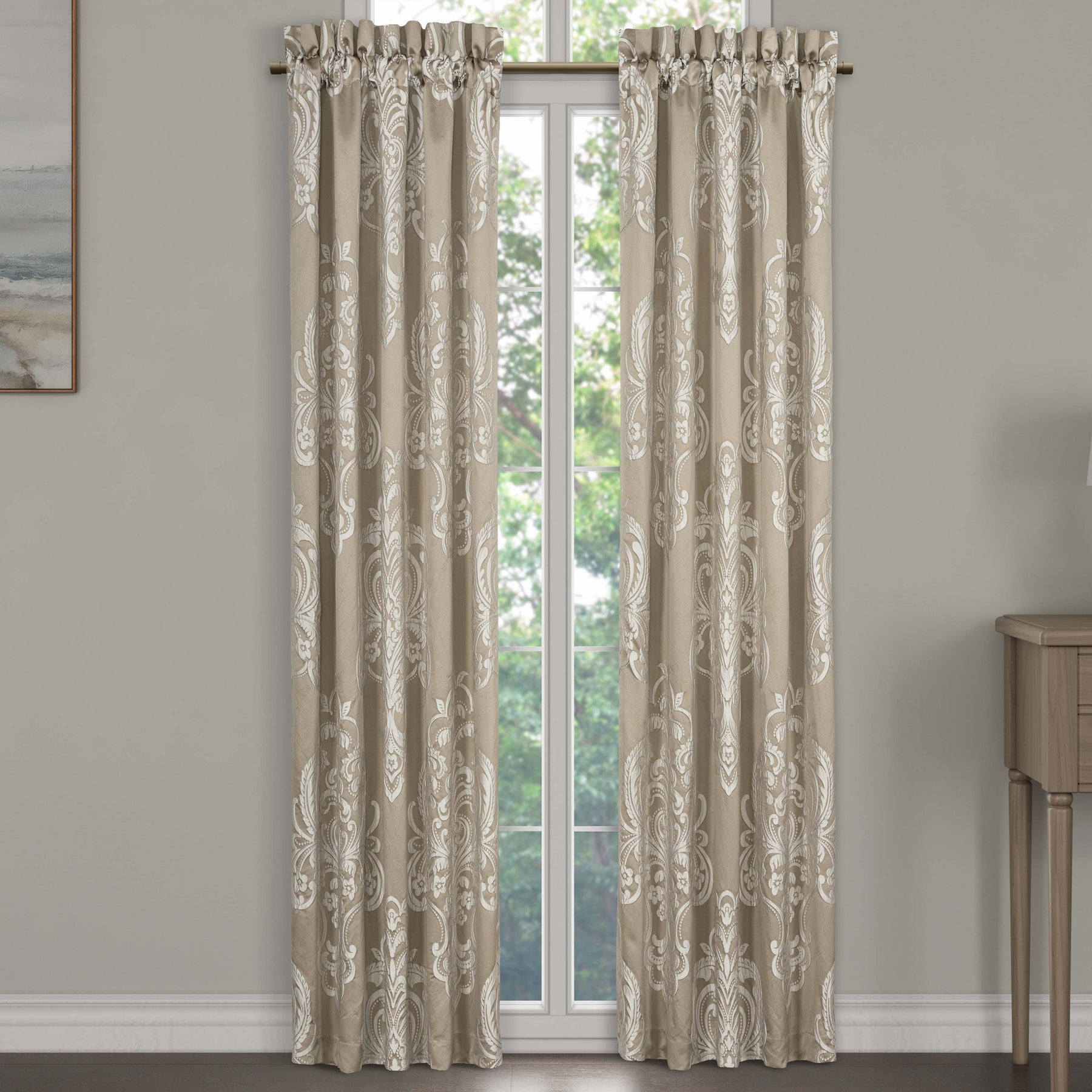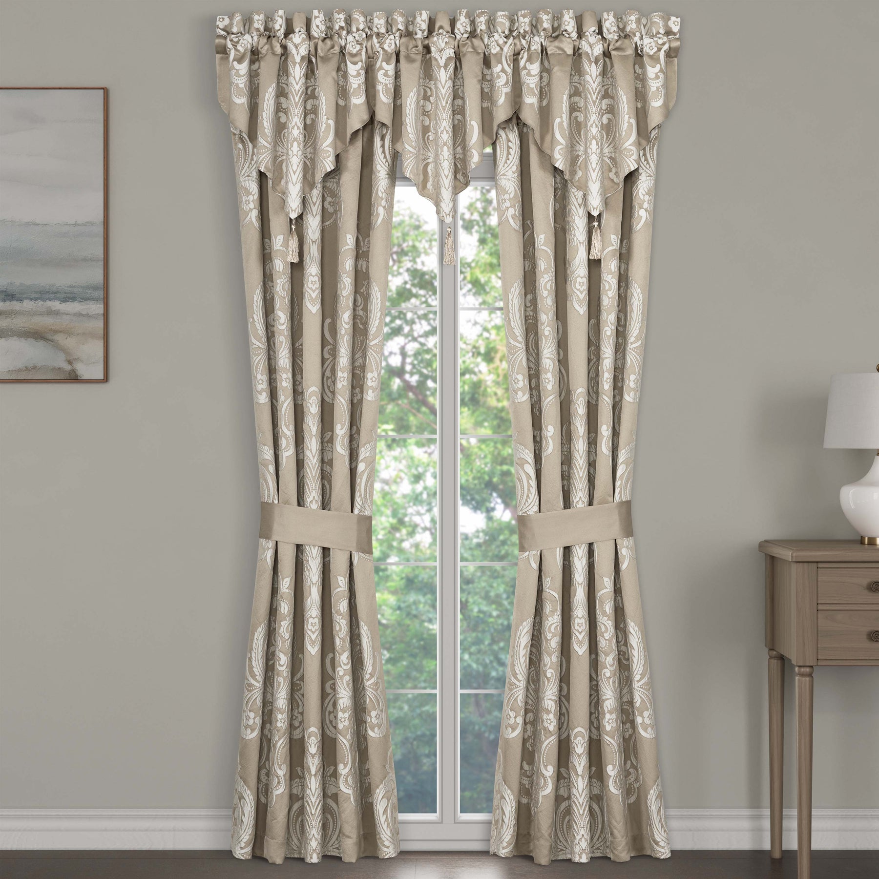 The potenza window panels feature a grand woven damask design in soft ivory and neutral sandy hues. Fully lined to keep your room cool and the curtains include coordinate tiebacks. Pair these panels with the potenza bedding set and window valance for a complete timeless traditional look.