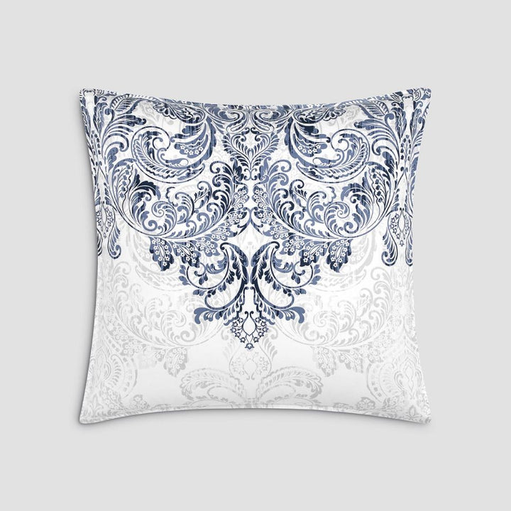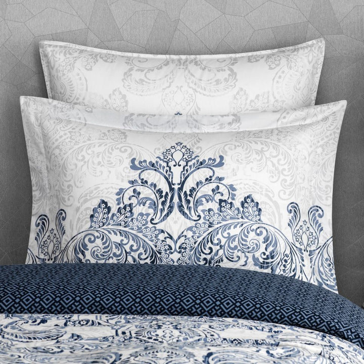 The fabric of bed linen Flevoland is soft, pleasant to the touch and durable cotton-satin. It is a beautiful material with a silky sheen. Cotton-satin does not deform, the colors of the linen will not fade even if it is used for a long time. The best grades of long staple cotton have been used to make this kit. Long cotton fibers make a very durable material that perfectly absorbs moisture. Cotton textiles are eco-friendly, this fabric is breathable, does not accumulate static electricity and does not cause discomfort. The lines of the classic damasc ornament, made in noble shades of rich blue and azure blue, form ornate openwork weaves. The same ornament in light grey is repeated on a white background of linen, like a subtle shadow or reflection. The set is double-sided. An original addition to the classic pattern is a spectacular diamond-shaped geometric print in the same rich blue tones. It adorns the opposite side of the duvet cover, pillowcases and the sheet of Flewland. The rectangular pillowcases of this set are decorated with wide decorative borders.