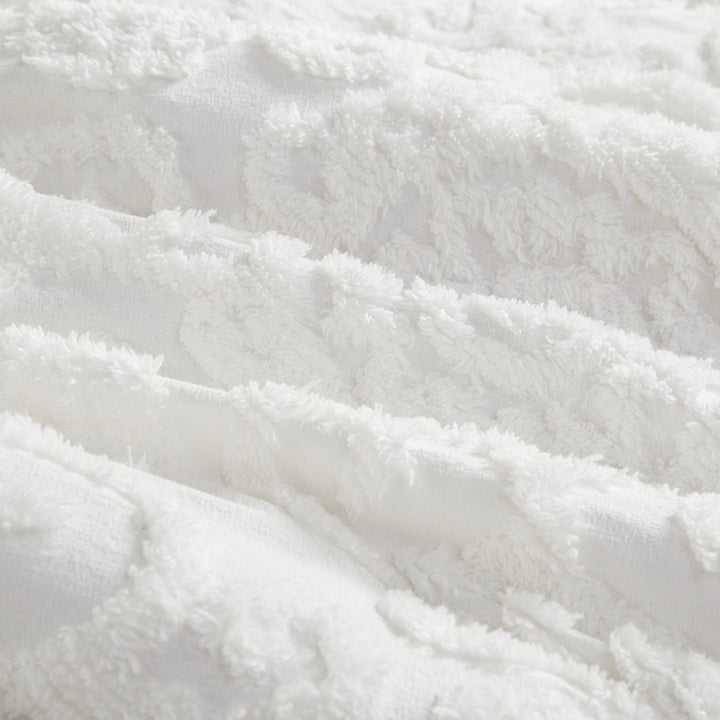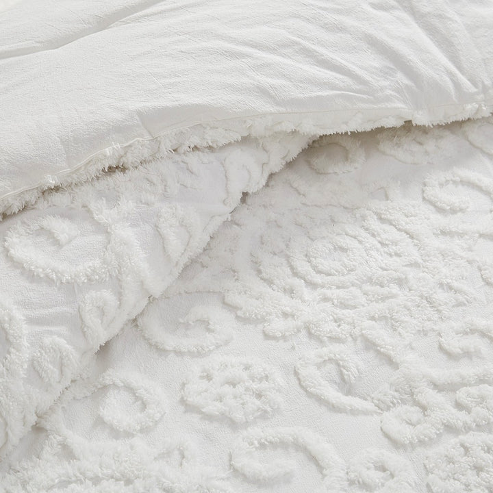 Delicately tufted medallions are beautifully showcased throughout this comforter in a gorgeous white
