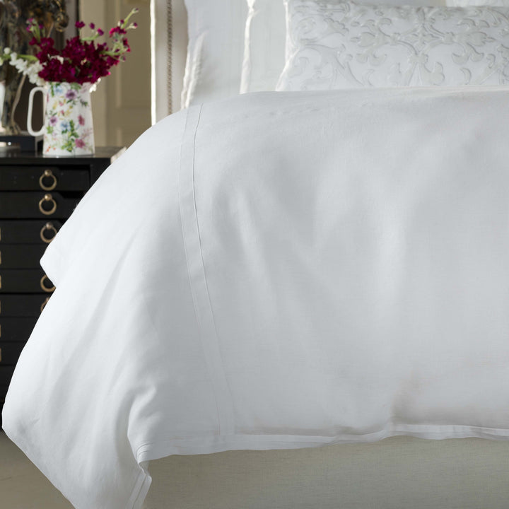 The Bloom Double Flange Duvet Cover is made with White Linen. A duvet insert is not included. Machine Washable.