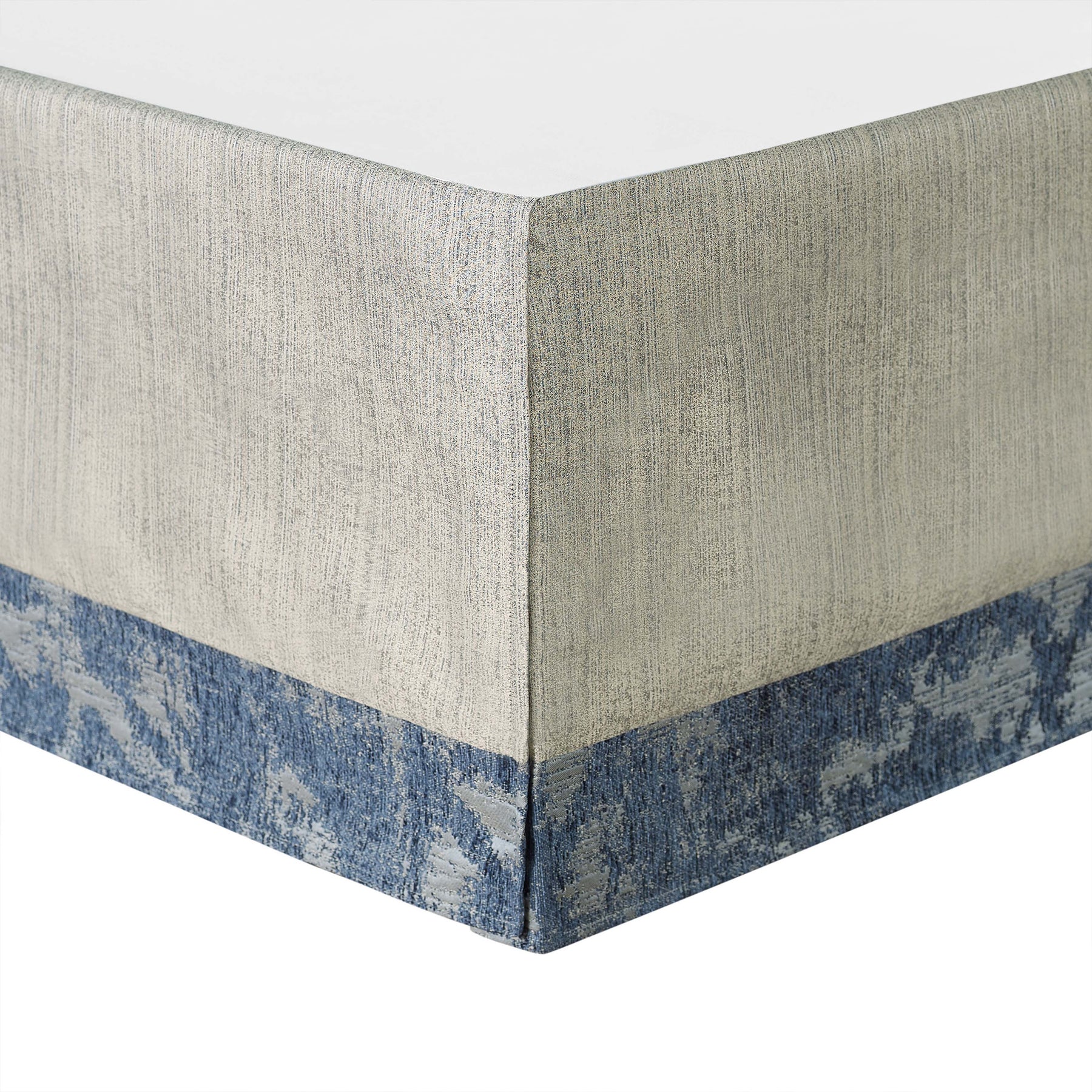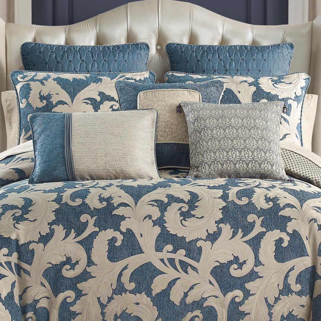 The Waterford Fine Linens Laurent collection features an over scaled taupe scroll on a navy ground with a grand presence, perfect for a master bedroom. The rich textures of the chenille adds to the luxurious look. The comforter and shams reverse to a trellis jacquard. The blue euro shams are fully reversible with a quilted front reversing to chenille and finished with a hidden zipper closure. Pillow inserts sold separately. Completing the set is a tailored taupe bedskirt finished with a textured blue trim.